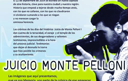 Muestra fotográfica: Las imágenes que componen la muestra, fueron tomadas durante las sesiones del Juicio de Monte Pelloni I, bajo la coordinación de la cátedra de Fotografía de la Carrera de Comunicación Social a cargo del Docente Julio Menajovsky. Las fotografías fueron realizadas para difusión pública por los siguientes autores: Dante Lartirigoyen, Juan Derdoy, Paloma Uranga, Elizabet Kenny, Malena Gioia, Stefanía Schegtel Torres y Sol Vázquez. Diseño y edición de la muestra: Dante Lartirigoyen.