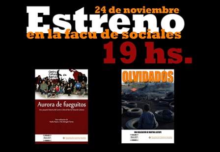 Aurora de fueguitos: un documental centrado en la historia reciente del Centro Cultural Barrial Eduardo Galeano, ubicado en la escuela Nº 13 del barrio Villa Aurora. Este espacio ofrece a los vecinos de barrio y a la comunidad en general diferentes talleres. Realizado por Noelia Nazer y Estefanía Schegtel Torres.