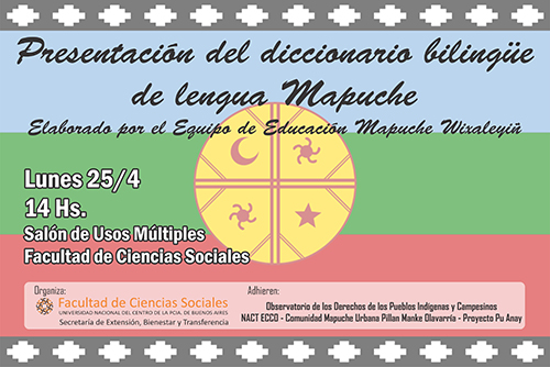 21/04/2016 - El próximo lunes 25 de abril se realizará en la Facultad de Ciencias Sociales la presentación del diccionario bilingüe de idioma Mapuche elaborado en el marco de un proyecto de extensión de la Universidad Nacional del Centro