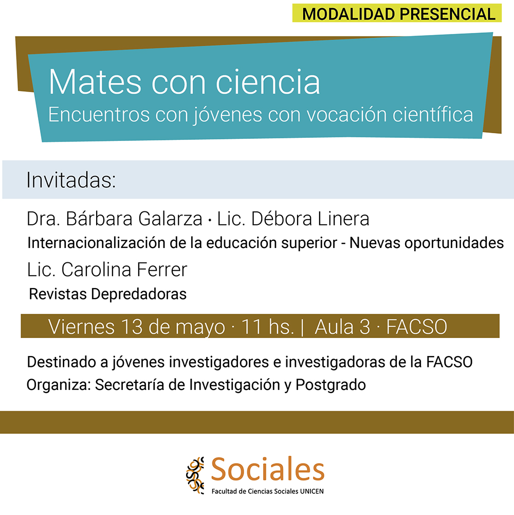 05/05/2022 – El viernes 13 de mayo se realizará la tercera edición del “Ciclo de charlas y capacitaciones para jóvenes con vocación científica”, organizado por la Secretaría de Investigación y Postgrado de la Facultad de Ciencias Sociales.