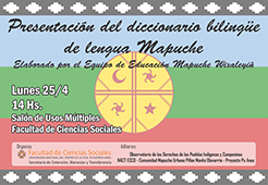 21/04/2016 - El próximo lunes 25 de abril se realizará en la Facultad de Ciencias Sociales la presentación del diccionario bilingüe de idioma Mapuche elaborado en el marco de un proyecto de extensión de la Universidad Nacional del Centro