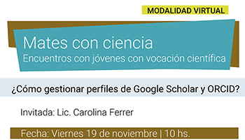 11/11/2021 - En el marco de los encuentros para jóvenes con vocación científica “Mates con Ciencia”, el viernes 19 de noviembre a las 10 horas se realizará una charla virtual sobre la creación y actualización de los perfiles de Google Scholar y ORCID. La actividad es organizada por la Secretaría de Investigación y Postgrado de la Facultad de Ciencias Sociales y está destinada a jóvenes becarios/as, investigadores e investigadoras de la FACSO.