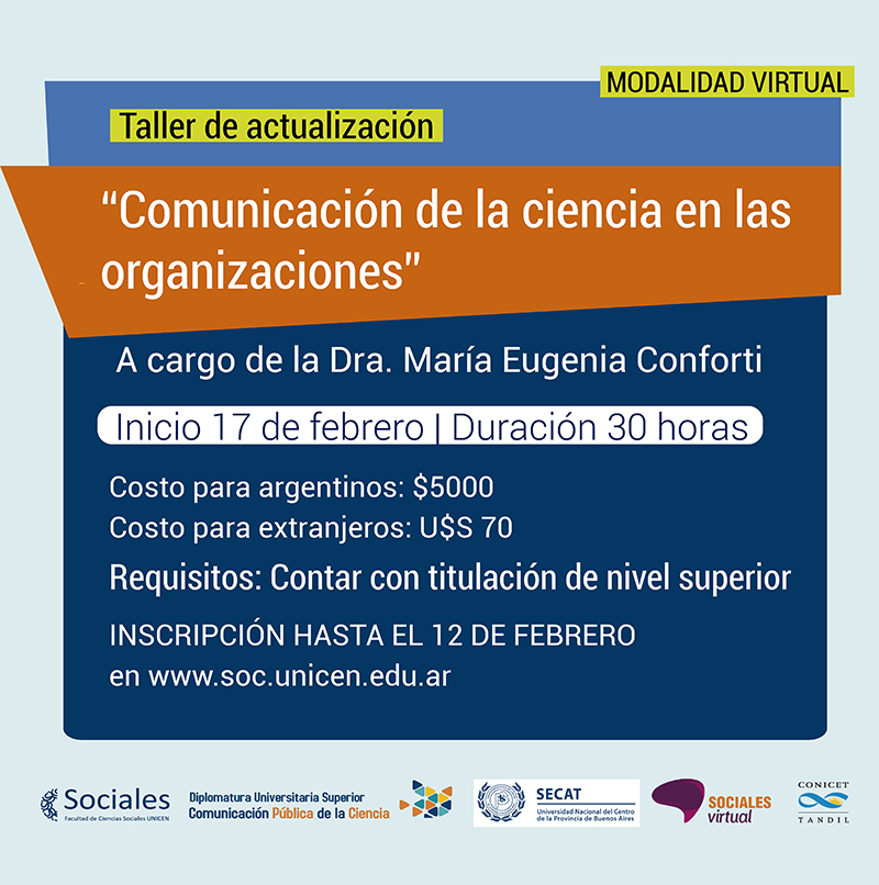 El mismo estará a cargo de María Eugenia Conforti, Dra. en Ciencias Sociales y Humanas (UNQuilmes), y Lic. En Comunicación Social, con orientación en Comunicación Institucional (UNICEN). Actualmente se desempeña como Investigadora Adjunta de CONICET, con lugar de trabajo en el Instituto de Investigaciones Arqueológicas y Paleontológicas de Cuaternario Pampeano (INCUAPA, Unidad Ejecutora CONICET), Docente de la Facultad de Ciencias Sociales (UNICEN) y Coordinadora de la Diplomatura Universitaria Superior en Comunicación Pública de la Ciencia (UNICEN).