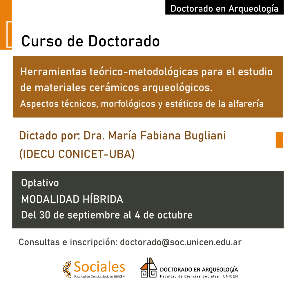 La Dra. María Fabiana Bugliani (IDECU CONICET-UBA) dictará el curso optativo "Herramientas teórico-metodológicas para el estudio de materiales cerámicos arqueológicos. Aspectos técnicos, morfológicos y estéticos de la alfarería", propuesta del Doctorado en Arqueología de FACSO.